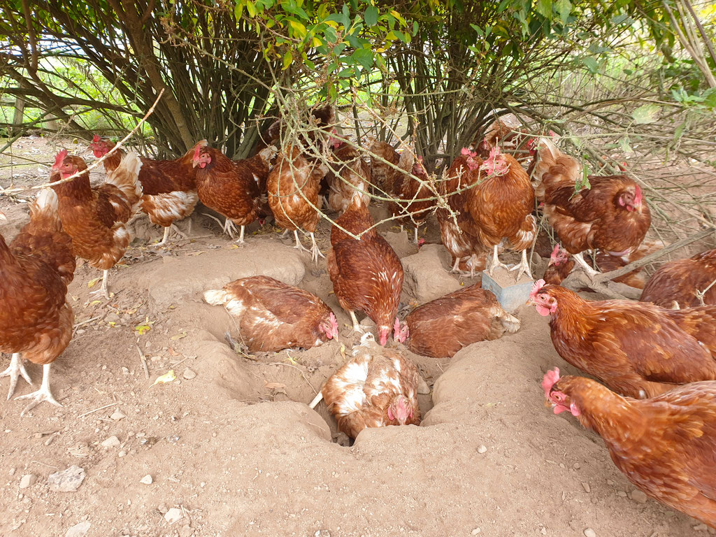 21.10.2025: Hühnerwellness im Herbst, die Hennen lieben ihr Sandbad unter dem Strauch!